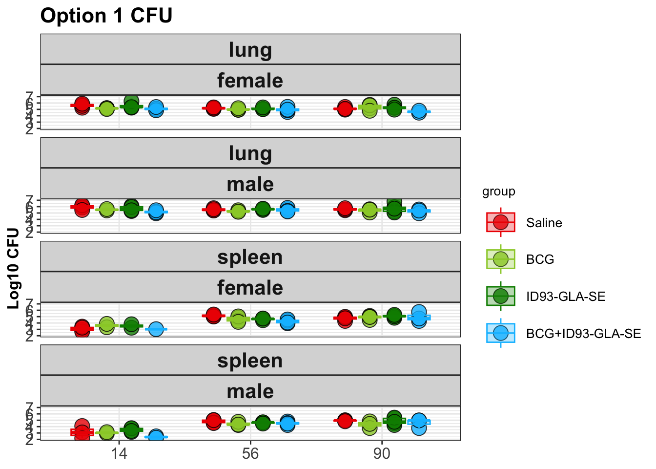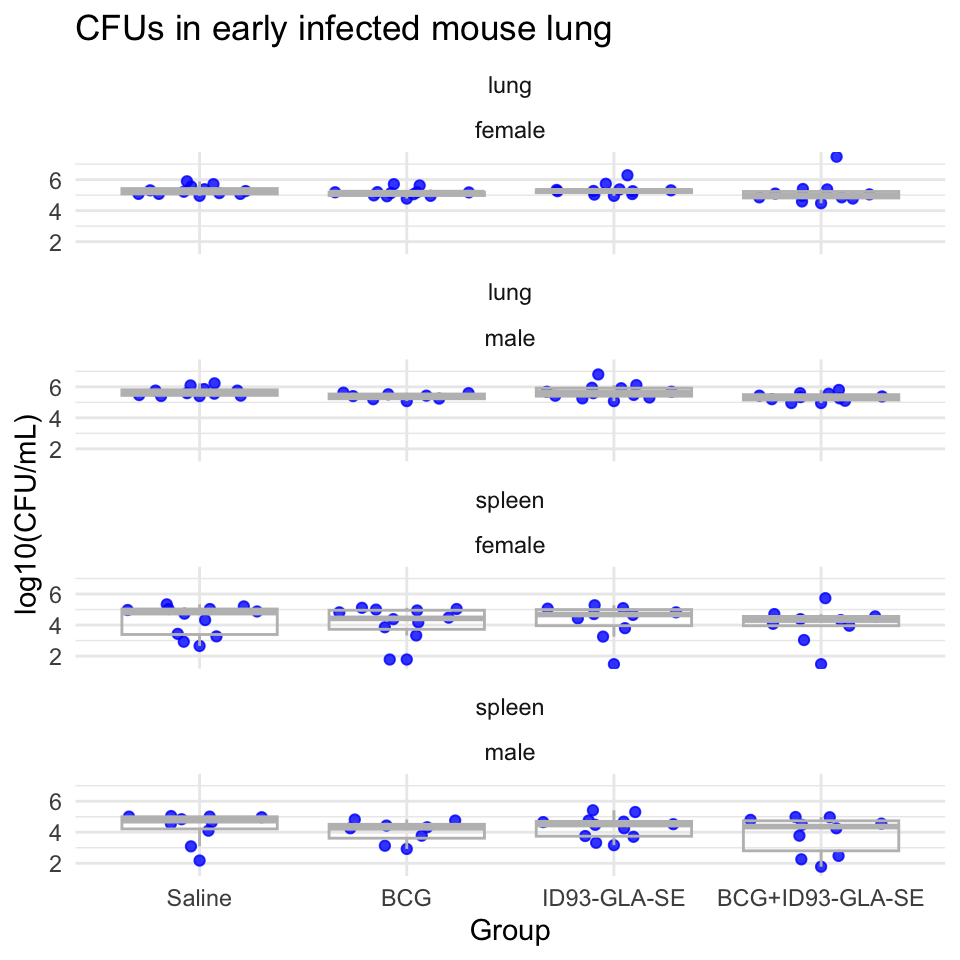 Next, the pipeline creates a plot showing the distribution of CFUs by experimental group in each of the organs:
