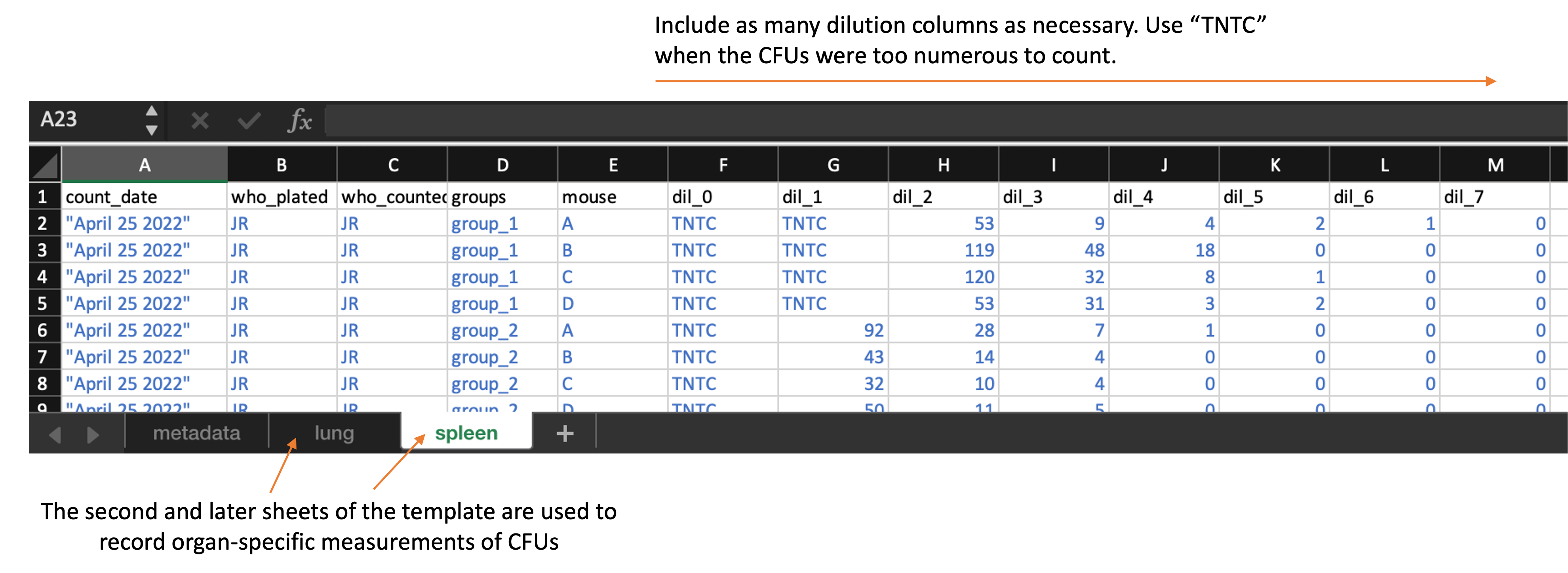 The data are collected in a spreadsheet with multiple sheets. The first sheet (named “metadata”) is used to record some metadata for the experiment, while the following sheets are used to record CFUs counts from the plates used for samples from each organ, with one sheet per organ. For example, if you plated data from both the lung and spleen, there would be three sheets in the file: one with the metadata, one with the plate counts for the lung, and one with the plate counts for the spleen.