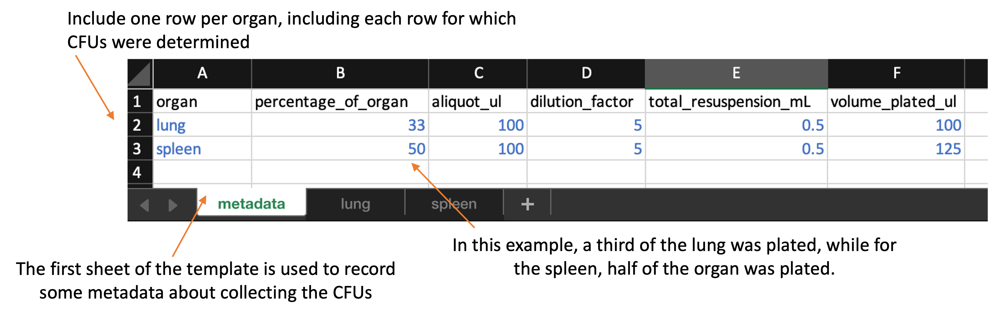 organ: Include one row for each organ that was plated in the experiment. You should name the organ all in lowercase (e.g., “lung”, “spleen”). You should use the same name to also name the sheet that records data for that organ for example, if you have rows in the metadata sheet for “lung” and “spleen”, then you should have two other sheets in the file, one sheet named “lung” and one named “spleen”, which you’ll use to store the plate counts for each of those organs. -